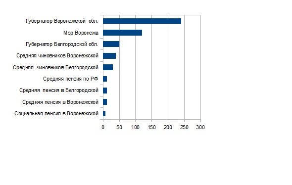 Для сравнения: средняя пенсия по области составила в 2014 году лишь 40% (10 тыс руб) от средней областной зарплаты. А средняя областная зарплата (24 тыс руб) в 2,1 раза ниже средней зарплаты воронежского чиновника из исполнительной власти.