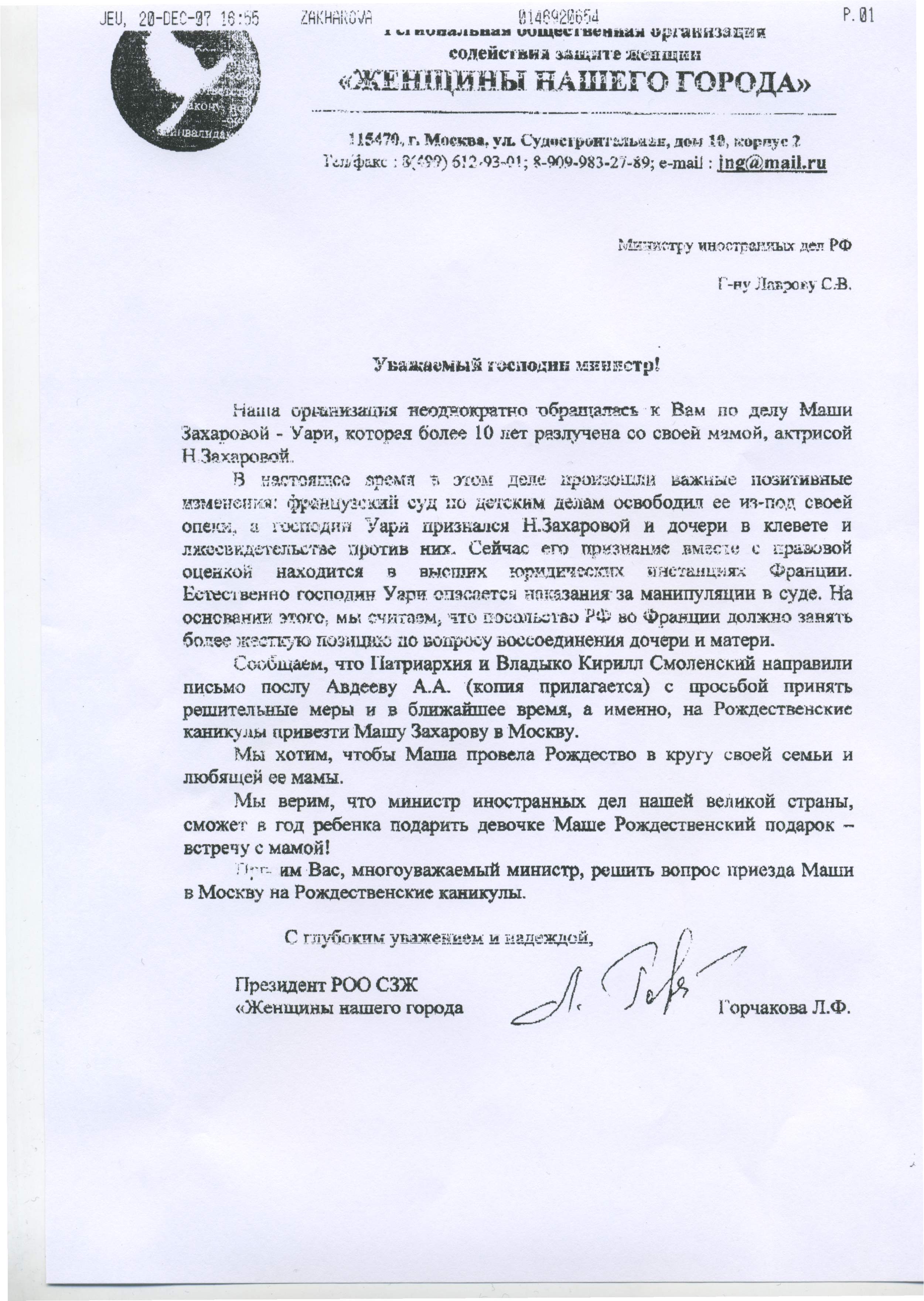 Уважаемый господин министр! Наша организация неоднократно обращалась к Вам по делу Маши Захаровой - Уари, которая более 10 лет разлучена со своей мамой, актрисой Н. Захаровой. В настоящее время в этом деле произошли важные позитивные изменения: французский суд по детским делам освободил ее из-под своей опеки, а господин Уари признался Н. Захаровой и дочери в клевете и лжесвидетельстве против них. Сейчас его признание вместе с правовой оценкой находится в высших юридических инстанциях Франции. Естественно господин Уари опасается наказания за манипуляции в суде. На основании этого; мы считаем, что посольство РФ во Франции должно занять более жесткую позицию по вопросу воссоединения дочери и матери. 21.12.2007 год