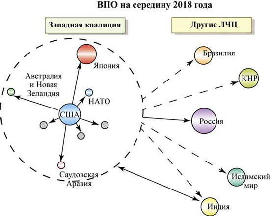 Своего рода «маркером», подтверждающим развитие ВПО по такому сценарию в начале июня 2018 года стало одновременное проведение совещания «Большой семёрки» и ШОС, которые неформально представляли западную военно-политическую коалицию, с одной стороны, и антизападную широкую коалицию китайской, индийской, исламской и российской ЛЧЦ, – с другой. Примечательно, что ходе этой встречи руководители Китая и России обсудили именно военно-политические вопросы, касающиеся прежде всего политики западной коалиции. Такое обсуждение можно рассматривать в качестве первого принципиального шага к созданию очень широкой коалиции разных центров силы, обеспокоенных усиливающимся давлением со стороны Запада. Так, в разделе, относящемся к глобальной безопасности, руководители Российской Федерации и КНР Владимир Путин и Си Цзиньпин отметили в совместном заявлении от 8 июня 2018 года, что в условиях сложной и изменчивой международной обстановки обе стороны «продолжат наращивание двустороннего стратегического взаимодействия в международных делах, будут вести углубленное обсуждение широкого круга вопросов международной и региональной повестки дня, а также выводить двустороннюю координацию внешнеполитических ведомств двух стран и взаимную поддержку на мировой арене на качественно новый уровень».