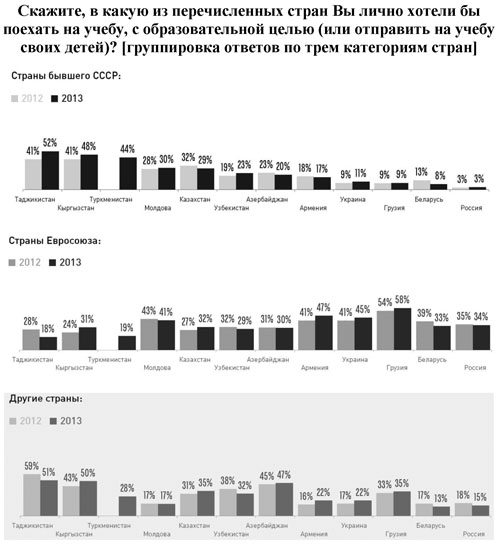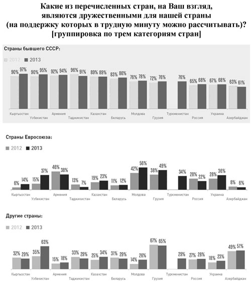 В 2012 году лишь в Казахстане доля ответов "Страны бывшего СССР" (32%) превышала доли ответов, приходящиеся на каждую из двух остальных категорий (27% на страны Евросоюза и 31% на остальные страны), но это превышение не являлось статистически значимым[5].