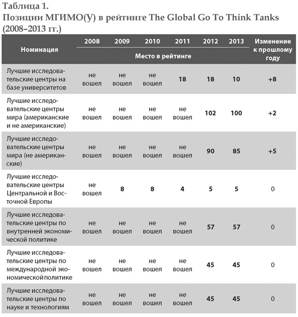 Институциональное лидерство МГИМО-Университета в международных исследованиях подтверждается репутационными показателями признания со стороны российских и зарубежных коллег. По данным международного репутационного рейтинга исследовательских центров Go to Think Tanks, в 2013 г. МГИМОУниверситет вошёл в десятку лучших исследовательских центров мира на базе университетов и в первую сотню лучших исследовательских центров мира. Он сохранил 5-е место среди исследовательских центров Центральной и Восточной Европы, 57-е место среди исследовательских центров по внутренней экономической политике, 45-е место среди исследовательских центров по международной экономике, а также по науке и технологиям (см. таблицу 1).
