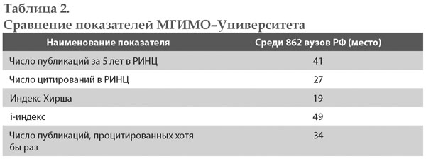 Науку сегодня принято оценивать в том числе и по наукометрическим показателям публикационной активности. Учитывая, что российские общественные и гуманитарные науки довольно плохо представлены в международных библиографических базах данных, таких как Scopus и Web of Science, оценивать показатели научно-публикационной активности МГИМО-Университета целесообразно по базе данных Российского индекса научного цитирования (РИНЦ). Показатели МГИМО-Университета в РИНЦ свидетельствуют о сравнительно высоком качестве научных исследований авторов нашего университета (см. таблицу 2). При этом следует отметить, что гуманитарный профиль МГИМО-Университета не создаёт конкурентных преимуществ в наукометрии. Классические университеты с естественно-научными факультетами всегда будут опережать вузы гуманитарного профиля по показателям научнопубликационной активности. Это связано с различиями в культуре цитирования между гуманитарными и естественно-научными дисциплинами. Тем не менее, даже при неравных исходных условиях МГИМО-Университет занимает, например, 19 место по показателю индекса Хирша среди российских вузов.