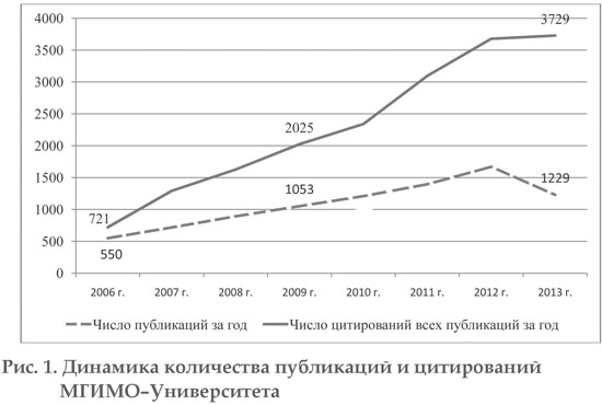 С каждым годом отмечается прирост количества цитирований и публикаций МГИМО-Университета в РИНЦ (см. рис. 1). Количество цитирований растёт опережающими темпами, что указывает на качество публикаций.