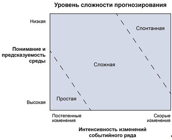При этом, разные типы прогностических ситуаций, справедливо отмечает А.О. Безруков, – можно визуализировать на графике, где ось «Х» демонстрирует интенсивность изменений событийного ряда, а ось «Y» отражает предсказуемость того, какой она будет в будущем[26]. Или, другими словами, степень предсказуемости зависит от интенсивности изменений[27]. В нашем случае это означает, что конкретный сценарий ВПО, а тем более МО прогнозируется в зависимости от того, насколько существенны и динамичны изменения, происходящие в самых разных элементах (факторах, тенденциях, отдельных событиях), составляющих его структуру[28].