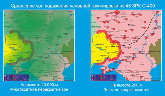 Наконец, объективно армия РФ стала не просто в 5 раз меньше ВС СССР, но и качественно другой, когда её главные функции резко изменились. Так, например, больной вопрос в настоящее время для всех – беспилотники (БПЛА), которые стали принципиально новой угрозой для страны и её ПВО. Надо понимать, что СССР, создавая ПВО и ПРО страны, преследовал цели защиты от массированного нападения с помощью авиации и баллистических и крылатых ракет. Соответственно лучшие в мире системы ПВО СССР-России – С-300 и С-400 – развертывались для отражения этих атак. Этот вид (впоследствии род) войск в России вообще не предполагался для защиты от БПЛА. Основной способ прорыва ПВО ударными БПЛА – полёт на предельно малых высотах (200 м). Как признает ведущий эксперт в этой области на разница в задачах ПВО очень наглядно демонстрируется на следующих картах[8],