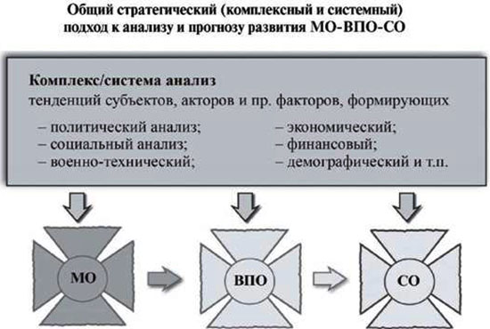 Каждый из этих «блоков» информации и знаний предполагает не только собственное и часто самостоятельное исследование ВПО и политики субъекта, но и анализ его взаимосвязей с другими «блоками» и отдельными проблемами влияющими на формирование МО-ВПО-СО. Важно подчеркнуть, что как МО, так и ВПО характеризуется определенным состоянием субъектов и акторов внутри самих этих систем, которые развиваются, взаимодействуют (иногда противоречат друг другу), противоборствуют[4]. Причём в самом современном состоянии уже заложена их история, традиции, инерция и последствии. И в нём же существуют условия для прогноза будущего состояния, обязательные для стратегического планирования внешней и военной политики.