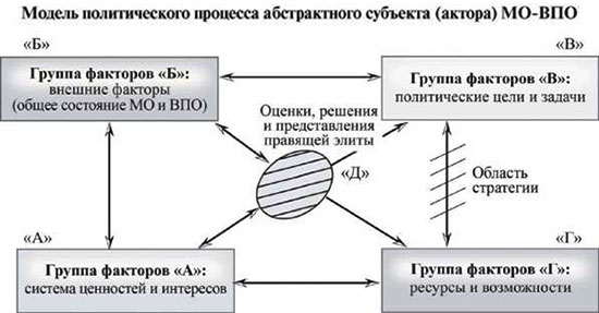 Важно для оценки будущего состояния МО и ВПО максимально точно определить политику этого конкретного субъекта, имеющую иногда (как, например, политика Германии в 1939 и в 1941 гг.) решающее значение. Поэтому в таком анализе должны быть исследованы не только важнейшие политические, экономические и финансовые интересы и цели, но и системы ценностей, субъективные представления и оценки правящей элиты и многие другие факторы влияния, которые в предлагаемой модели сведены в 5 основных групп и вытекающих из них областей (например, области «стратегия»). Ни одна из таких групп не может быть решающей, а тем более единственной, при оценке политики субъекта. Точная характеристика может быть дана только на основе анализа всех этих групп, включая анализа субъективных, психологических и культурно-исторических особенностей правящей элиты субъекта.