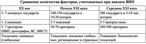 Динамика изменений большинства факторов и тенденций, формирующих МО и ВПО, такова, что можно говорить о взрывообразном росте численности таких факторов и тенденций, их показателей и критериев, которые прежде не только не учитывались, но даже и вообще не принимались во внимание. Так, если в XIX и XX веках анализ МО и ВПО ограничивался по сути только анализом военных потенциалов несколько ведущих государств (демографии, экономики, армии, артиллерии флотов и пр. критериев мощи основных европейских держав и США), то в XXI веке этого стало уже явно недостаточно. Появилась острая потребность и реальная возможность учитывать гораздо больше число факторов, – участвующих в формировании не только ВПО, но и СО. Так, например, существующие возможности позволяют контролировать СО в космическом пространстве с участием 150 тыс. объектов.