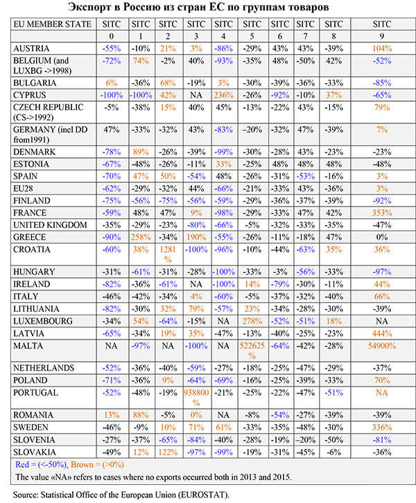 В таблице ниже показано изменение экспорта стран ЕС между 2013 и 2015 годами в соответствии с классификацией международных стандартов (SITC). Так, наиболее пострадавшей оказалась категория № 4 (животные и растительное масло) и категория № 0 (продовольствие), которые стали результатом российских контрсанкций[1].