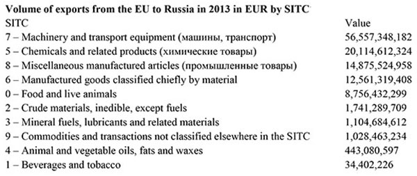Другими словами, значение России в торговле стран ЕС достаточно небольшое и очень слабо влияет на принимаемые политические решения. Для некоторых стран ЕС и Европы падение экспорта в Россию в части областей было достаточно заметным, но в масштабах общего объема внешней торговли говорить об их сильном влиянии не приходится. Иногда представители тех или иных пострадавших секторов могут говорить о резком падении – это в действительности так, – но для общей картины внешней торговли эти явления не стоит преувеличивать. Представление о падении объемов внешней торговли по отдельным группам товаров дают следующие данные: