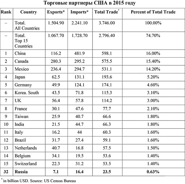 Примерно аналогичная, даже более «скромная» ситуация наблюдается и в отношениях с США, где обращает на себя внимание то, что Россия не просто не входит в число 15 ведущих торговых партнеров США, но даже и не приближается к ним. Это означает, что внешняя торговля не могла быть и не была с самого начала решающим фактором в развитии санкционной политики Запада в отношении России в 2014–2017 годы. Как видно из таблицы, оборот торговли США с Россией составлял чуть более половины процента.