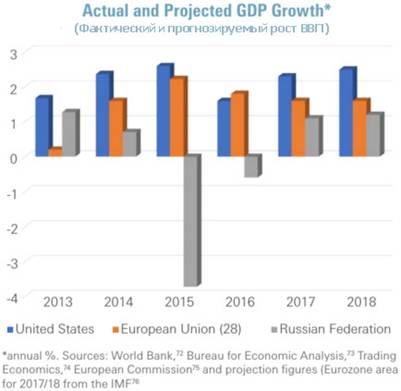 Во многом поэтому следует скептически отнестись к самой возможности Запада рассчитывать на радикальное влияние санкций на экономику России. Падение ВВП в 2015–2016 годах в России, как уже говорилось, было прежде всего следствием падения цен на нефть и внутренними причинами, связанными с провалами в экономической политике.