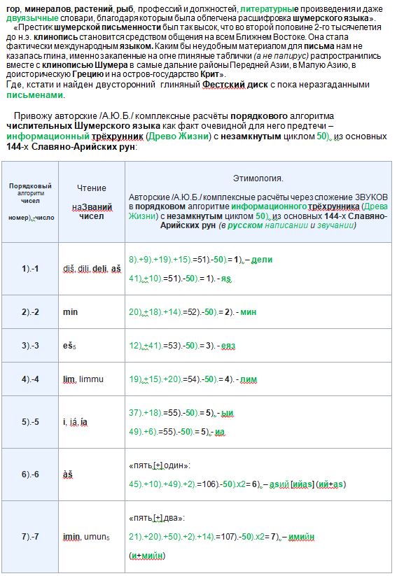 Привожу авторские /А.Ю.Б./ комплексные расчёты порядкового алгоритма числительных Шумерского языка как факт очевидной для него предтечи – информационный трёхрунник (Древо Жизни) с незамкнутым циклом 50). из основных 144-х Славяно-Арийских рун: