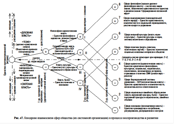 Взаимозависимость сфер общества (форм власти) на 3-м уровне генодрева. Сферы общества (их иерархия идет сверху от духовных сфер): 8) единая философия и мораль, 7) законодательная власть (самоуправление), 6) единая культура и система воспитания, образования; 5) политики (политических партий), 4) единая идеология (религия), 3) бюрократическая система управления (исполнительная власть), 2) национально-семейный образ жизни, 1) экономика. Т.о., стоящие ниже единой философии сферы общества (законодательная, исполнительная власти, идеология, религии и др.) не обладая полнотой знания, не могут единолично направлять развитие общества. Для управления целостной эволюцией общества должен формироваться высший орган государства – Высший Совет, включающий в себя представителей всех 8-и сфер общества. Очевидно, что его работа должна основываться на принципах демократического централизма.