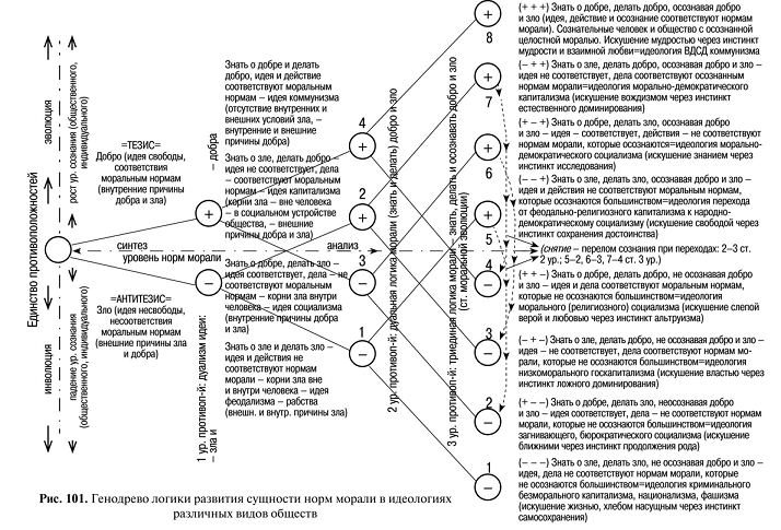 На втором уровне противоположностей генодрева показаны иерархо-логические взаимосвязи дуальной логики (диаграмм) морали (добра и зла) с 4-я видами идеологий обществ (два знака + или – означают 2 уровня познания: -знать - мировоззрение; -делать - идеология): 1) ( -,-) знать (идея) о зле и делать зло - идея (мировоззрение) и действие (идеология) не соответствуют морали (закону) – идея феодализма, рабства; 3) (+, -) знать о добре и делать (преодолевать) зло, идея соответствует, дела (идеология) не соответствуют нормам морали – идея социализма (иначе – доброе зло, дополнив: тезис – необходимость, мораль, а/тезис- свобода, итог- социализм –моральная свобода) ; 2) (-, +) знать о зле и делать добро (соблюдать законы), идея не соответствует, дела (идеология) соответствуют законам, находящимся ниже уровня норм морали – идея капитализма (иначе – злое добро, с дополнением – свободная мораль); 4) (+,+) знать о добре (морали, законах) и делать добро (соблюдать законы), идея и дела соответствуют моральным нормам – идея коммунизма (или идеология социально-справедливой и нравственной единой общечеловеческой религии, к которой рано или поздно придет человечество).