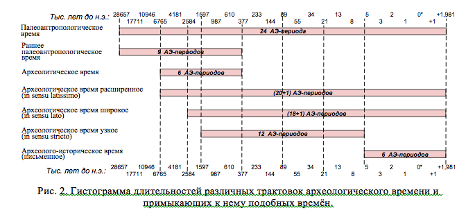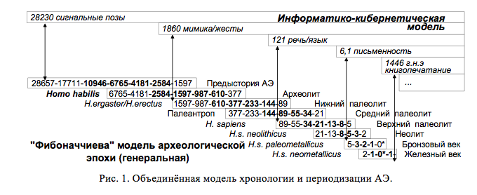 Напомним, что сам термин «археологическая эпоха» (АЭ) обозначает ту часть истории человечества, содержание, процессы, эволюцию и историю которой восстанавливают и изучают по археологическим источникам [Щапова 2005:15]. «Фибоначчиева» модель хронологии и периодизации АЭ (опирающаяся на известный в математике «ряд Фибоначчи», выстроенный в обратном порядке, в тыс. лет до н.э.: – 28657 – 17711 – 10946 – 6765 – 4181 – 2584 – 1597 – 987 – 610 – 377 – 233 – 144 – 89 – 55 – 34 – 21 – 13 – 8 – 5 – 3 – 2 – 1– 1 [Щапова, 2000, 2005, 2011]), хорошо соответствуют датам, установленным поколениями археологов эмпирически.