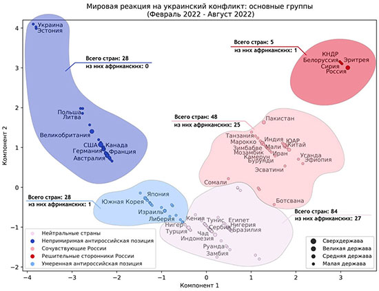 Очевидно, что соотношение сил в мире, характеризующее состояние МО-ВПО в 2022 году[17], уже в следующем году изменилось. Оно отчасти характеризуется отношениями государств (в данном случае стран Африки), проанализированное сотрудниками НИИ МГИМО при помощи метода соотношения компонентов[18]. Авторы, в частности, делают вывод: Реакция на украинский кризис стала сложным явлением международных отношений. Многие страны в той или иной степени затушёвывают свою позицию, стараются, особенно на декларативном уровне, сделать её расплывчатой.