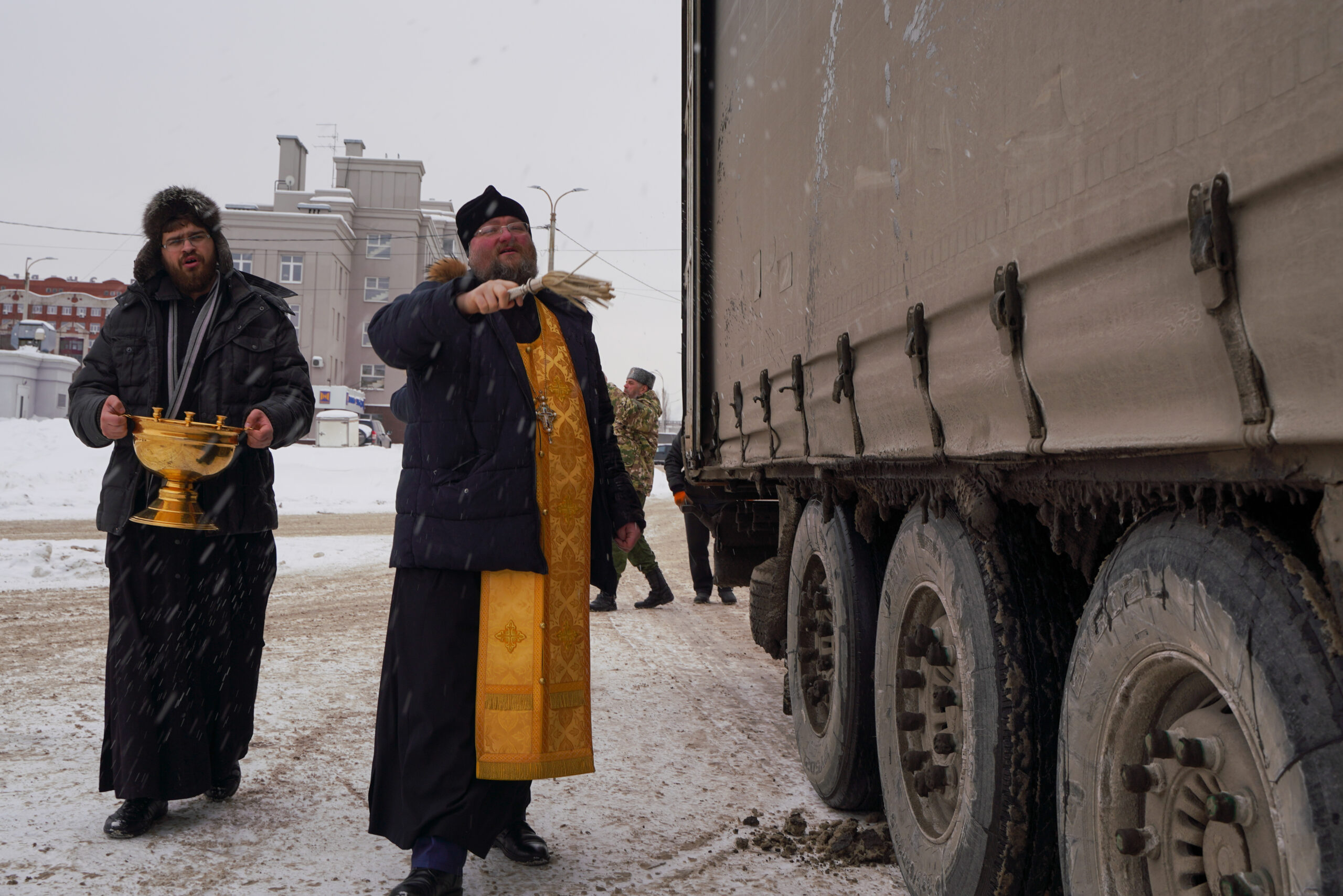 Молебен перед отправкой совершил руководитель отдела Нижегородской епархии по взаимодействию с Вооруженными силами и правоохранительными органами протоиерей Александр Малафеев. Перед богослужением он обратился к собравшимся — представителям общественных организаций и добровольцам, которые собирают и доставляют гуманитарные грузы в зону СВО.