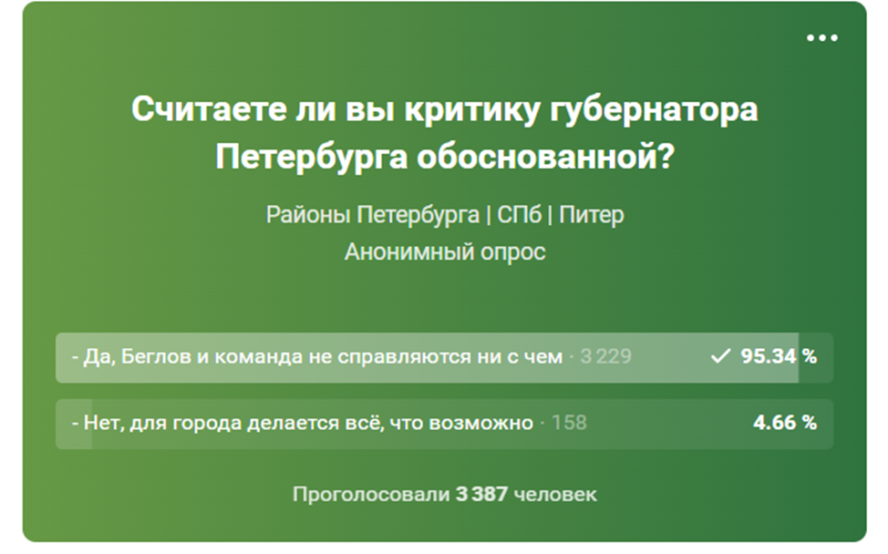 Несмотря на это петербуржцы считают, что критика в адрес действующего управленца обоснована и заслужена. Соответствующие выводы можно сделать по результатам опроса в группе «Районы Петербурга» во «ВКонтакте».