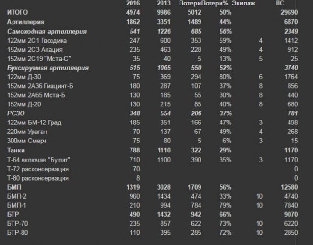 За два года войны на Донбассе украинская армия потеряла 50% самоходных артиллерийских систем, 52% буксируемой артиллерии, 37% реактивных систем залпового огня, 29% танков и 56% БМП различных модификаций.