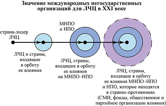 В нарастающих межцивилизационных противоречиях XXI века эволюция негосударственных акторов в направлении от «нации-государства» в сторону «нации-цивилизации» имеет огромное значение. Прежде всего потому, что представляет некоторым ЛЧЦ огромные внешние дополнительные ресурсы влияния и развития. Эти ресурсы прежде активно использовались только в идеологической борьбе СССР и контролируемым Интернационалом, а затем Социалистическим содружеством, но сегодня это становится правилом для любой ЛЧЦ. Так, в событиях 2013–2016 годов на Украине самое активное участие приняли антироссийские общественные и международные организации, которые фактически создали необходимый ресурс для борьбы с законной властью.