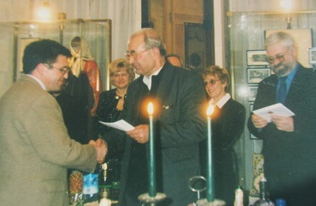 Из альбома выпало старое фото. Калужский краеведческий музей. Вечер. Зажженные свечи. Счастливые лица. Лацис радостно жмет мне руку и вручает свернутый напополам листок. Помню, в нем был забавный стих, а может пародия - на меня. Или – на мои газетные вирши. Кажется, всё это дело сочинил Бабичев. Игорь - на фото справа и хмыкает себе в бороду.
