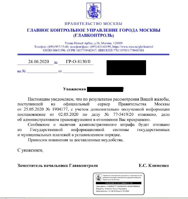 24 июня 2020 года за номером ГР-О-8130/0 получен ответ из Главного контрольного управления города Москвы, согласно которого штраф отменен. Принесены извинения. И нет объяснений, почему все же ложный штраф был выписан и кто в этом виноват. Хотелось бы получить ответ и в этой части.