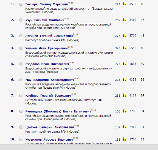 Топ-10 наиболее цитируемых по базе данных РИНЦ из 27859 российских авторов работ в области экономики