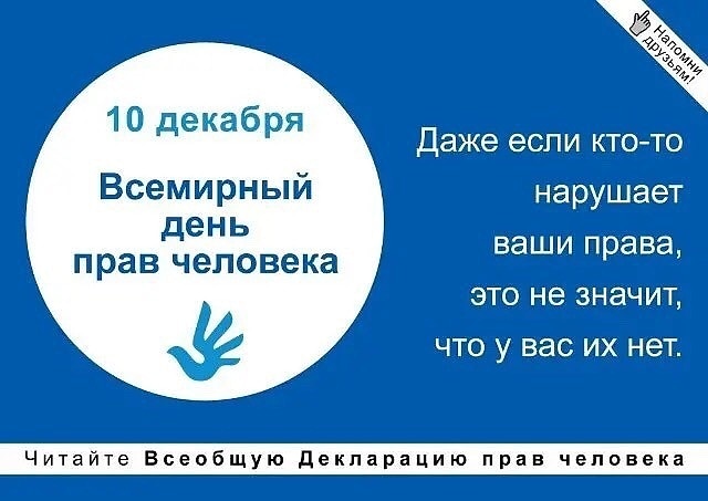 10 декабря Всемирный день прав человека. " Даже, если кто- то нарушает ваши права, это не значит, что к вам их нет"! читайте Всеобщую Декларацию прав человека.