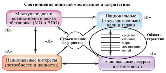 В целом политика и стратегия государств соотносятся как общее и частное, существующее во многом в субъективных представлениях правящей элиты и общества, которое условно можно изобразить на рисунке следующим образом[21]: