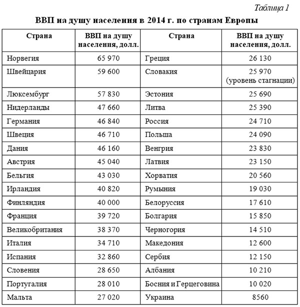 Данные Eurostat по уровню средней почасовой зарплаты в евро представлены в порядке убывания (табл. 1). В 2014 г. этот показатель снижался с 25,4 в Дании до 1,7 в Болгарии (т. е. соотношение 15:1). Внутри зоны евро данные разнятся от 18,3 в Люксембурге до 3,1 в Литве (6:1).