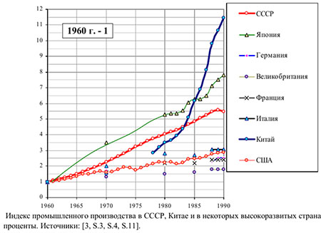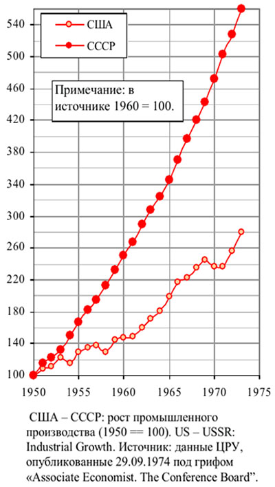 Важное место в подобной политике занимала дискредитация экономики, прежде всего, усилий СССР по обороне и роли ВПК, которые сознательно искажались. В частности, искажалась реальная динамика развития промышленности, которая в СССР отставала от динамики в Японии и в Китае, но значительно опережала динамику других промышленных стран того времени. Как видно на рисунке, за 30 лет промпроизводство в СССР выросло на 500%. Для сравнения: за те же 30 лет в России промпроизводство сократилось, как минимум, на 20%.