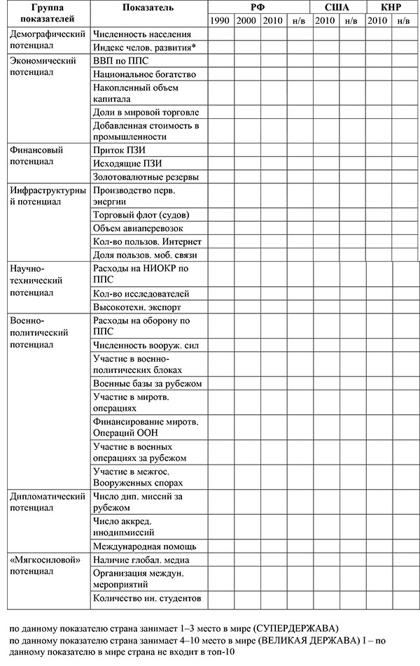 В настоящее время критически важными стали такие показатели как человеческий капитал (индекс человеческого развития) и уровень научно-технологического развития, используемые Д. Дегтяревым. По этим показателям Россия и отчасти Китай не могут составить конкуренции мировому лидеру – США. Но у них есть другие преимущества, которых нет у США. Это ресурсы политико-дипломатические, исторические, духовные и иные, способные компенсировать относительное отставание в финансово-экономической области.