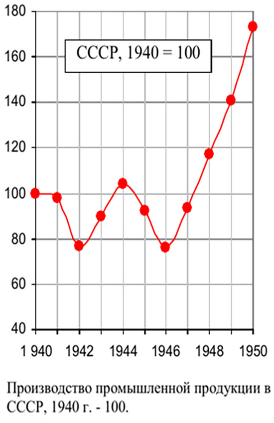 После оккупации и военных действий на территории СССР уже в 1948 году уровень промышленности и сельского хозяйства достиг довоенного уровня производства. ХIХ съезд КПСС в директивах по пятому пятилетнему плану на 1951-1955 годы поставил задачу увеличить выпуск промышленной продукции в 3, 2 раза чем в предвоенном 1940 году, т.е. на 320%. И этот план был выполнен. В эти же годы стремительно расширялась промышленная база ОПК СССР, которая ориентировалась, прежде всего, на опережающие темпы создания и производства обычных средств вооруженной борьбы и реактивной авиации, создания эффективных средств ПВО[4].
