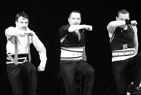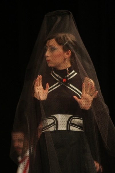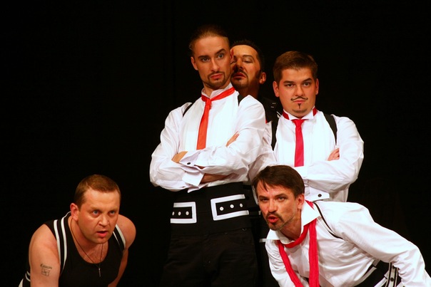 Стены задрапированы черным, пол белым. Герои одеты в черно-белые стилизованные костюмы с яркими вкраплениями: алые ленты как петли, на шее у влюбленных, галстуки, "мексиканские" шляпы. Ярких красок не много. Вероятно поэтому, в моем памяти отложились черно-белые линии... Пожалела, что не было с собой фотоаппарата. Хоть я и не умею толком фотографировать, но именно этот спектакль хотелось разложить буквально по кадрам. Движения героев, их взгляды, позы - готовый фотографический кадр. Пластика изумительная! И при всем при этом, не было ощущения, что действие искусственно - натянуто. Отнюдь! Живо, искрометно, естественно.