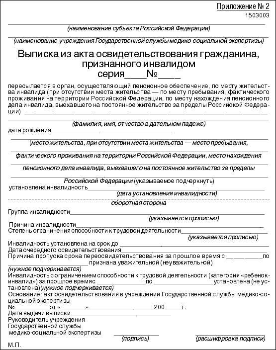 1. Реквизиты формы справки, подтверждающей факт установления инвалидности (далее - справка), и формы выписки из акта освидетельствования гражданина, признанного инвалидом (далее - выписка), заполняются в точном соответствии с записями аналогичных реквизитов в акте освидетельствования в учреждении Государственной службы медико-социальной экспертизы.
