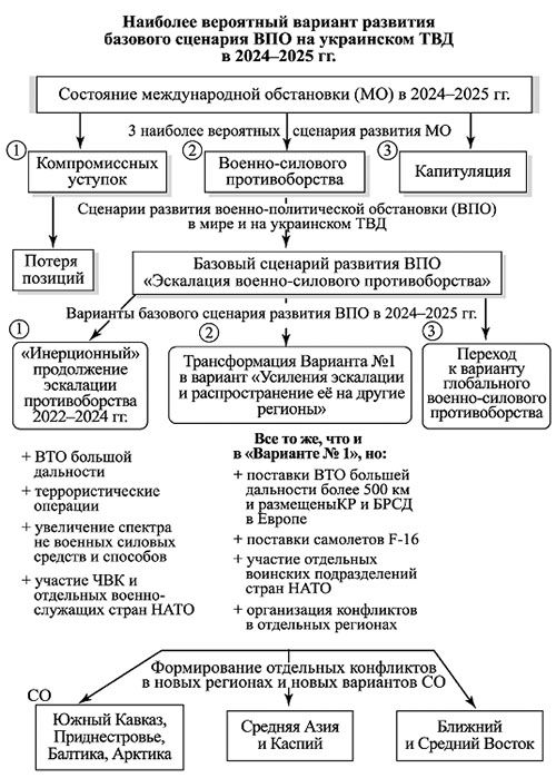 В феврале-марте 2024 года в Центре военно-политических исследований МГИМО МИД РФ была предложена схема наиболее вероятного развития сценария ВПО и наиболее вероятных его конкретных вариантов в 2024–2025 годах, которая актуальна и в настоящее время[1]. В частности, наиболее вероятным базовым сценарием развития ВПО был указан сценарий «Эскалации военно-силового превосходства» в нескольких наиболее вероятных вариантах, из которых до осени 2024 года, очевидно, стал постепенно реализовывался «Вариант № 1» – «Инерционное продолжение развитие эскалации». Его основные особенности также подтвердились (поставки ВТО, террористические операции и пр.). При этом была заметна и достаточно заметная тенденция перехода к «Варианту № 2» – «Усиление эскалации и распространение её на другие регионы». Эта тенденция угрожала стать реальностью уже в начале осени 2024 года. В числе наиболее вероятных регионов Армения, Молдавия, Казахстан и Таджикистан.