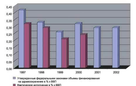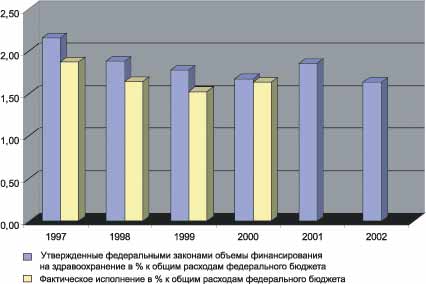 Анализ расходов федерального бюджета на здравоохранение показывает, что по-прежнему сохраняется финансирование отрасли по остаточному принципу. В 1999 году расходы на здравоохранение в общем объеме расходов федерального бюджета составили всего лишь 1,53% против 1,65% в 1998 году и 1,88% в 1997 году. И хотя в 2001 году удельный вес утвержденных на здравоохранение расходов был несколько выше 2000 года (1,86% и 1,68% в общем объеме расходов федерального бюджета), в 2002 году он снизился до 1,64%, что не свидетельствует об улучшении финансового обеспечения отрасли. Доля расходов на здравоохранение по отношению к валовому внутреннему продукту по-прежнему сохраняется на уровне 1998 года - 0,29% к валовому внутреннему продукту. Это меньше, чем в 1997 году (0,32% к валовому внутреннему продукту).