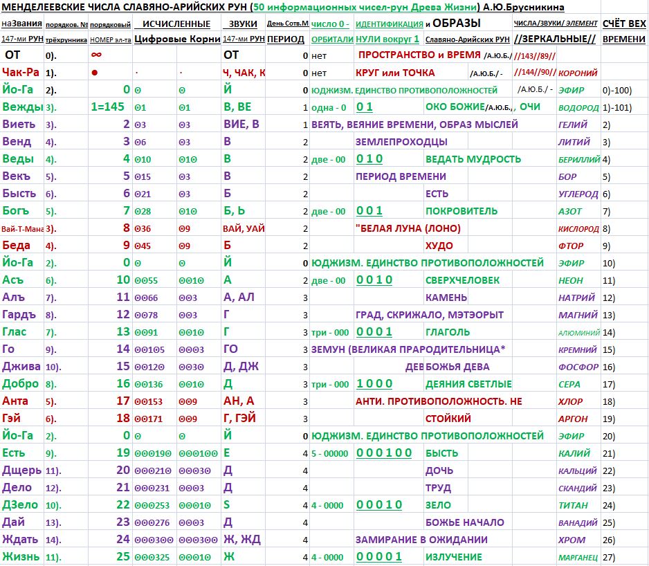 А.Ю.Брусникин: Приведу пример пирога, на который твоя бабуля Таня Вас с Ариной зовёт на Сретенье. Представим, что 50-т рун Древа Жизни, как и 50-т буквиц – званный «пирог». Весь пирог зовёт на ВСТРЕЧУ (СРЕТЕНЬЕ) как завет, и каждый его кусочек зовёт Вас как заветная встреча». Но отображение ЗВУКОВ рун [буквиц] может не всегда быть абсолютно точно по некоторым рунам [буквицам] как составной части их слов (что видно и по выше указанным авторским /А.Ю.Б./ комплексным расчётам. К тому же руны [буквицы] от ИНГЛИЯ [iЖЕИ] до ИТА [ФИТА] - /ЗЕРКАЛЬНЫ/ рунам [буквицам] от ЦЕЛЬ [ЦИ] до ЮРЪ. Но гипотеза твоя, Женя, наталкивает на авторские /А.Ю.Б./ комплексные расчёты в отдельной Главе для доказательства уже в рамках теории. В том числе о Древе Жизни в целом - как ЗАВЕТЕ.