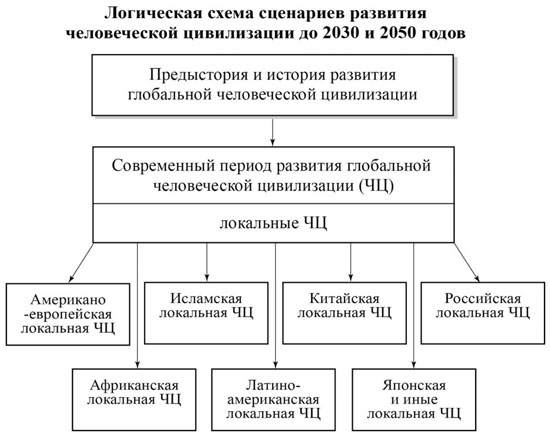 Для стратегических прогнозов ВПО и СО, как уже говорилось, принципиальное значение имеет прогноз сценариев развития человеческой цивилизации (ЧЦ), которые являются основой для формирования сценариев развития МО и, соответственно, ВПО и СО.