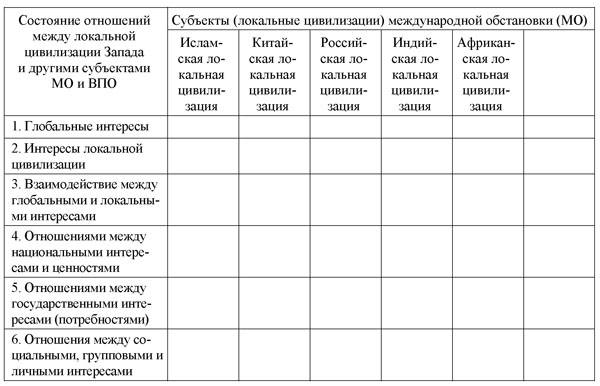 Таким образом современное состояние той или иной локальной цивилизации можно описать следующим образом, исходя из матрицы интересов (потребностей). На примере западной цивилизации это может выглядеть следующим образом.