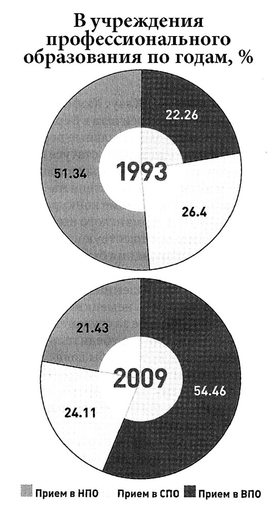 Таким образом очевидно, что существуют системные недостатки, которые множатся с годами. Развитие образования в России за последние 20 лет претерпело серьезные изменения в пользу количественного роста высшего образования и крупных университетов. Это хорошо видно на примере сравнения поступивших в учреждения начального (НПО), среднего (СПО) и высшего образования (ВПО) в 1993 и 2009 годах[14].