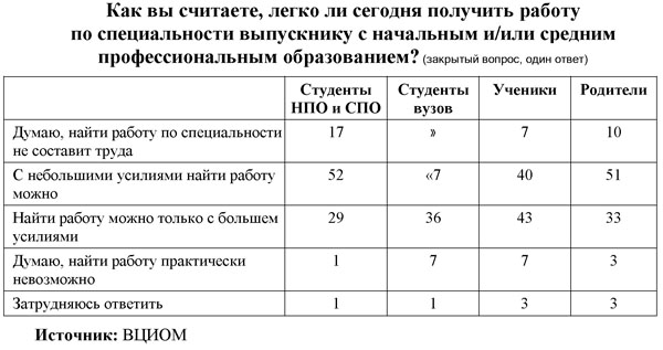 Мотивация - социальный запрос и экономическая необходимость - в выпускниках средних специальных и высших учебных заведений России - одна из основных проблем. Не секрет, что ни общество, ни экономика в последние десятилетия не оценивали человека по полученным знаниям. Не удивительно, что и сами студенты не очень уверены в своем будущем. В 2011 году только 17% и 9% выпускников были уверены, что они без проблем смогут устроиться на работу по специальности[15].