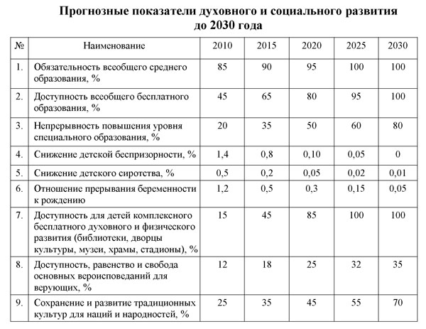 В соответствии с базовыми прогнозными показателями развития в таблице приведены основные показатели духовного и социального развития страны до 2030 года.