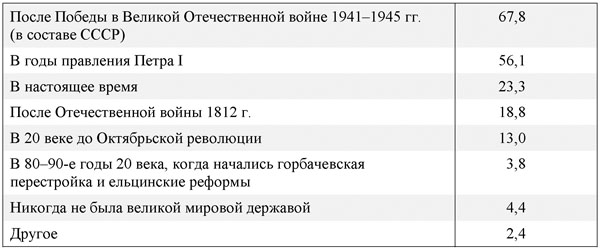 Но использование чужих гуманитарных знаний в качестве основы для исследований и принятые политических решений - уже вдвойне опасно, ведь они не учитывают ни культурной, ни исторической специфики России, а тем более ее устоявшихся реалий. Как, например, можно ответить, опираясь на чужие знания, на такой ценностной вопрос?[20]: В какие исторические периоды, на Ваш взгляд, Россия имела или имеет статус великой мировой державой? (Сумма ответов не равна 100%, так как по методике опроса можно было выбрать несколько вариантов. Ответы приведены в порядке убывания количества ответивших).