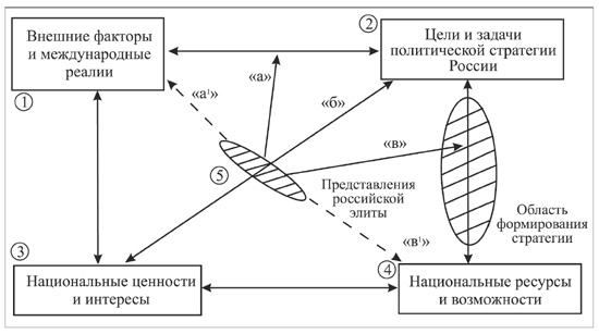 Для этого необходимо вновь вернуться к принципиальной схеме, в которой рассматривается взаимосвязь основных элементов политико-идеологической системы. Из нее, в частности, видно, как политическая стратегия России влияет на формирование международной системы безопасности. И. наоборот, как внешняя среда влияет на политическую стратегию российской элиты.