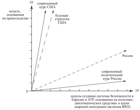 Если попытаться представить эти модели графически, то можно предположить, что акцент (по 10-и балльной шкале) по осям абсцисс и ординат, соответствующим преимущественной ориентации стратегии США и России, можно изобразить следующим образом: