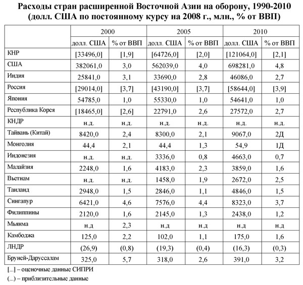 Помимо территориальных споров, основными военно-политическими вызовами безопасности в АТР по-прежнему остаются вопросы ядерного нераспространения в связи с очередным витком обострения ситуации на Корейском полуострове и хронические межгосударственные конфликты. Отмеченные проблемы совпадают с происходящей в странах региона военной модернизацией и общим ростом расходов на оборону[5].