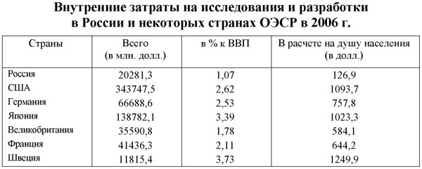 В условиях малосущественных стимулов к инвестированию в научные исследования и разработки со стороны частного капитала, бюджетное финансирование остается по-прежнему основным источником финансирования этой сферы. Однако, несмотря на наблюдаемый в последнее десятилетие их абсолютный рост, относительный уровень этих затрат постоянно снижался. И если в экономически развитых странах уровень расходов на науку в государственном бюджете составляет 4-5%, то в России он колеблется в пределах 1,6-2,0%.