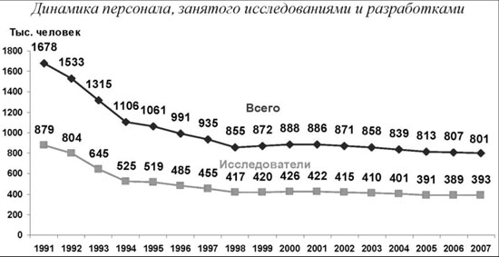 Кадровый потенциал науки в период 1990-2008 г. сократился более чем на 60%, в то время как в развитых странах мира наблюдался рост численности занятых в науке в среднем на 2,5-3% в год. Если в 1990 г. персонал, занятый исследованиями и разработками, насчитывал в России 1943,4 тыс. работников, то в 2007 г. их число составило только 801,1 тыс. чел. Число исследователей за тот же период сократилось с 992,6 до 392,9 тыс. чел., опустилось до уровня 35-летней давности.